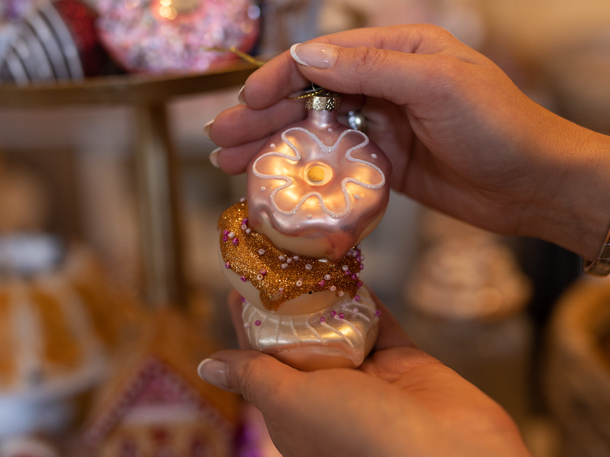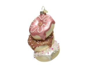 Bombka donut składa się z trzech lukrowanych pączków - jest to nietuzinkowa bombka na choinkę. Z pewnością przykuje uwagę osób, które kochają święta za obecność słodkich przekąsek.