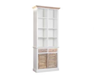 drzwiczki oraz szufladki wykonano z pobielonego drewna mango. Przesuwne, żaluzjowe drzwiczki kryją wbudowaną półkę. Białe, przedzielone półki świetnie wyeksponują dekoracyjne przedmioty oraz książki. Charakter mebla podkreślają delikatne przetarcia na drzwiczkach.