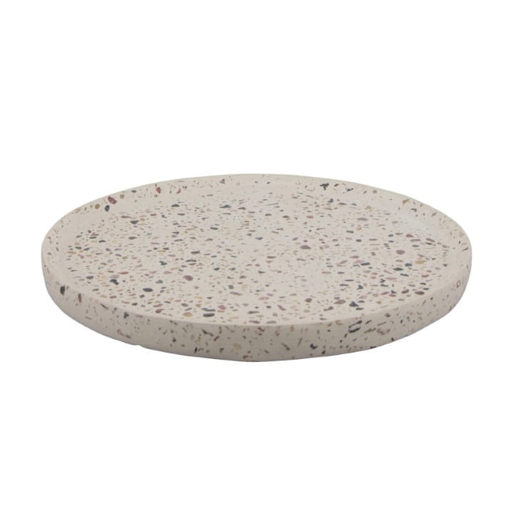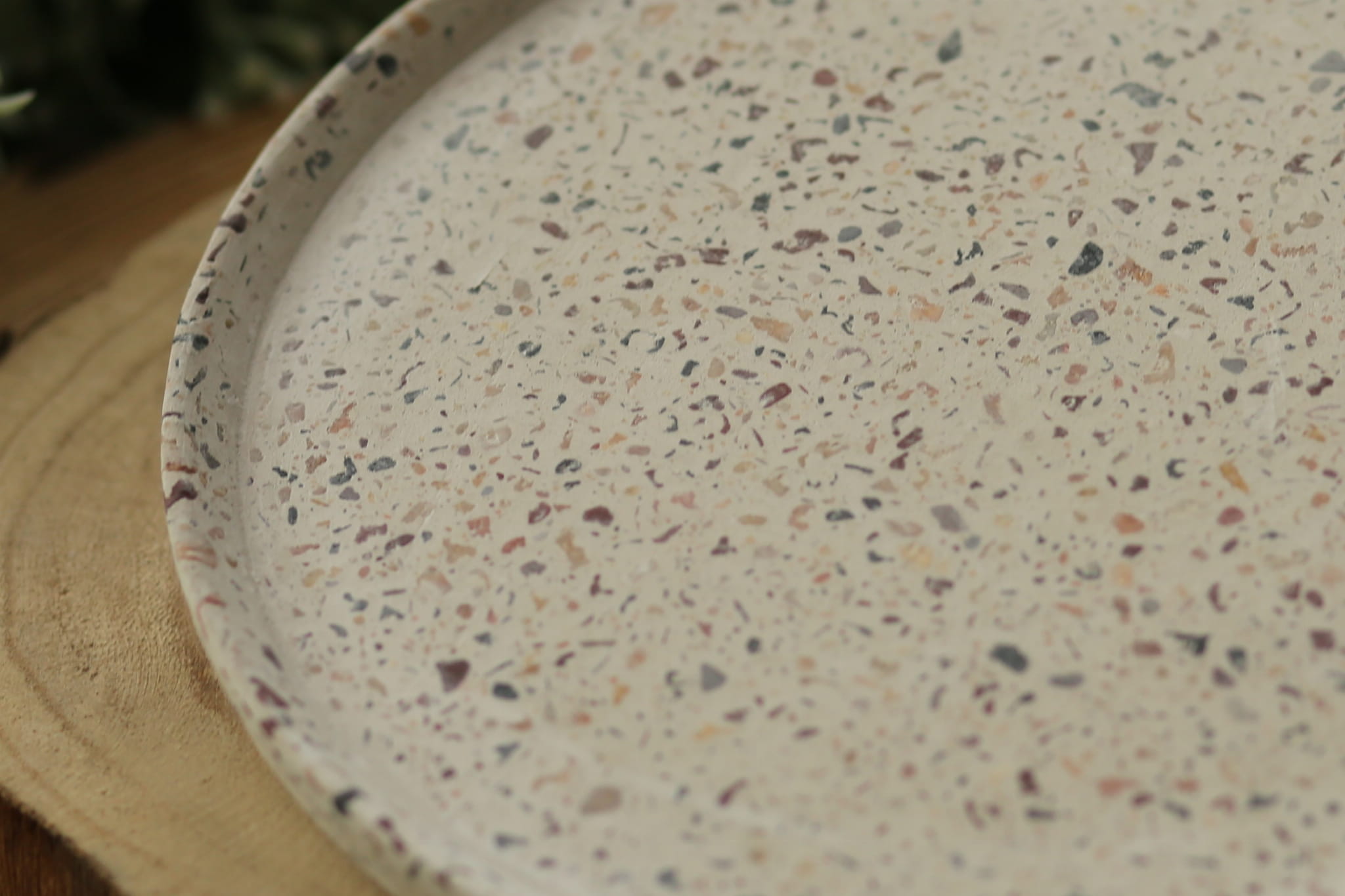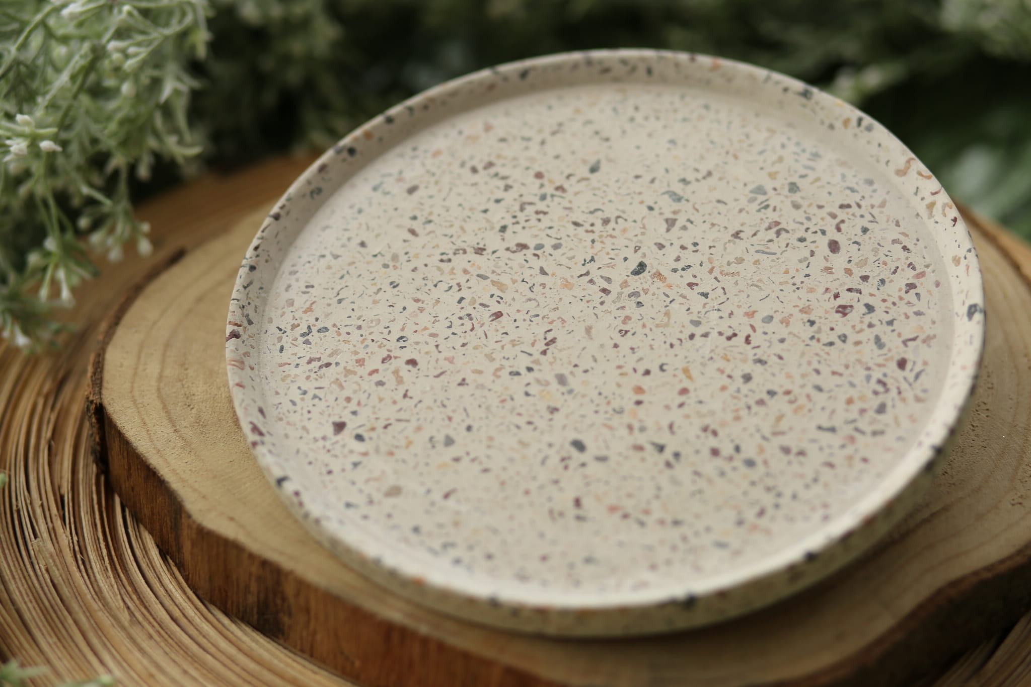 Cementowy talerz to solidna konstrukcja o eleganckim wyglądzie. Jego biała powierzchnia jest gładka, a na tle czystej bieli widoczne są różnokolorowe plamki, które nadają mu charakteru i wyjątkowego uroku.