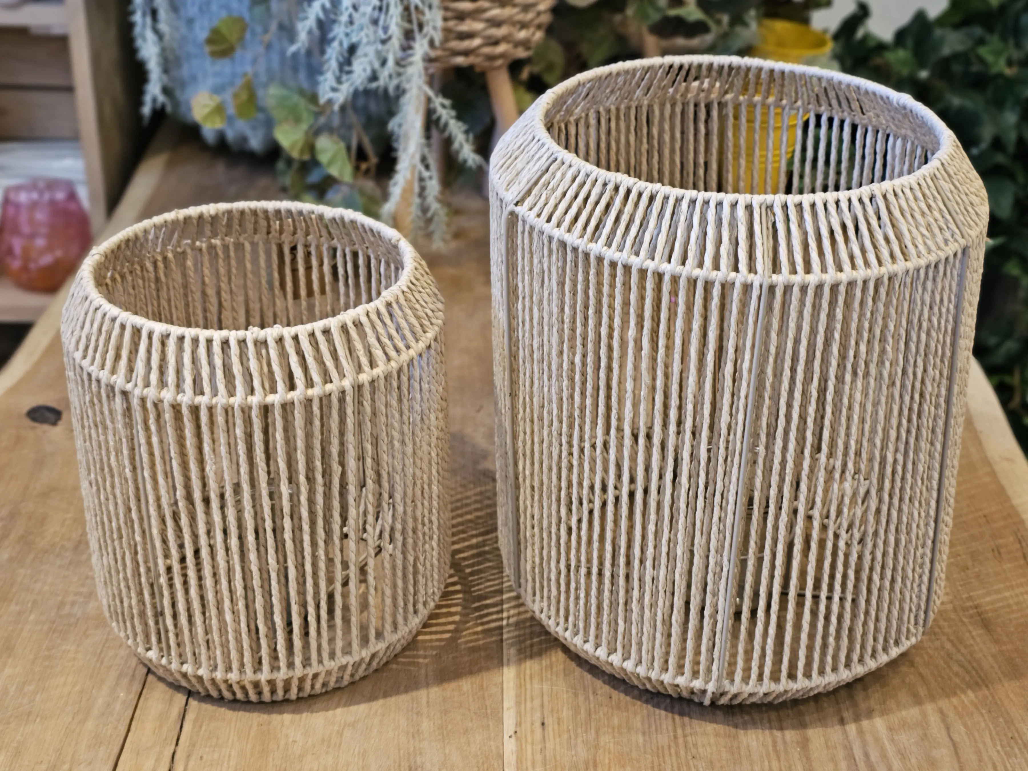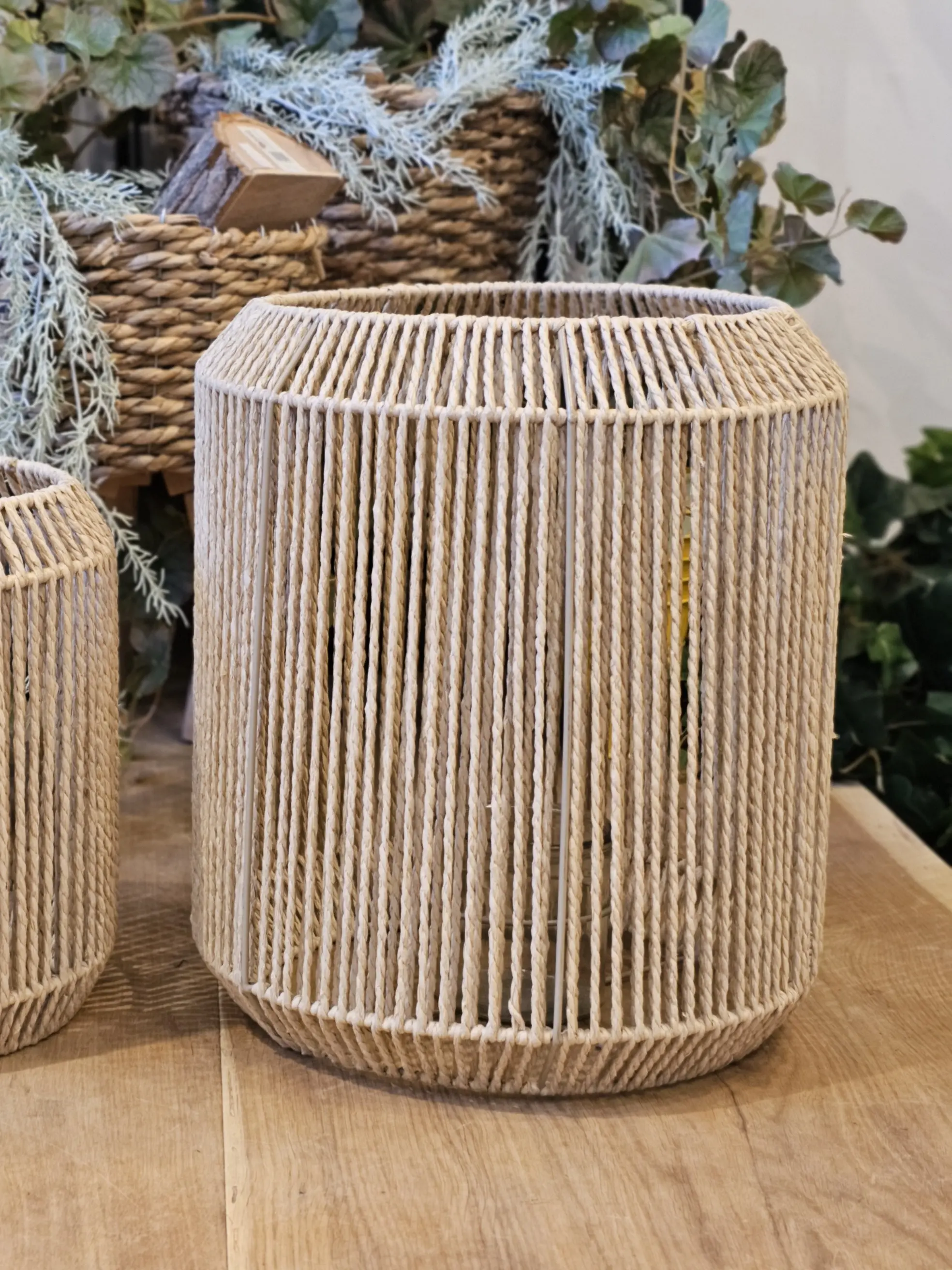 Lampion z naturalnego sznurka na metalowej formie, w środku znajduje się szklany pojemnik na świeczkę.