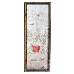 Malunek na szkle ukazujący przyrodę, ptaki wśród roślinności w donicy, zamknięty w drewnianej ramie stylizowanej na stary metal. Obraz ten to z pewnością dekoracja, która nada wnętrzu indywidualny charakter. Ciekawe dopełnienie aranżacji salonu, sypialni czy holu. Obraz występuje w dwóch wersjach, nieco inny wzór. Dwa różne ornamenty powieszone obok siebie będą wyglądać intrygująco i z pewnością zwrócą uwagę każdego gościa.