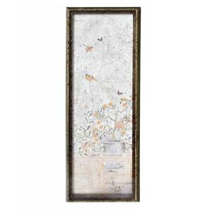 Malunek na szkle ukazujący przyrodę, ptaki wśród roślinności w donicy, zamknięty w drewnianej ramie stylizowanej na stary metal. Obraz ten to z pewnością dekoracja, która nada wnętrzu indywidualny charakter. Ciekawe dopełnienie aranżacji salonu, sypialni czy holu. Obraz występuje w dwóch wersjach, nieco inny wzór. Dwa różne ornamenty powieszone obok siebie będą wyglądać intrygująco i z pewnością zwrócą uwagę każdego gościa.